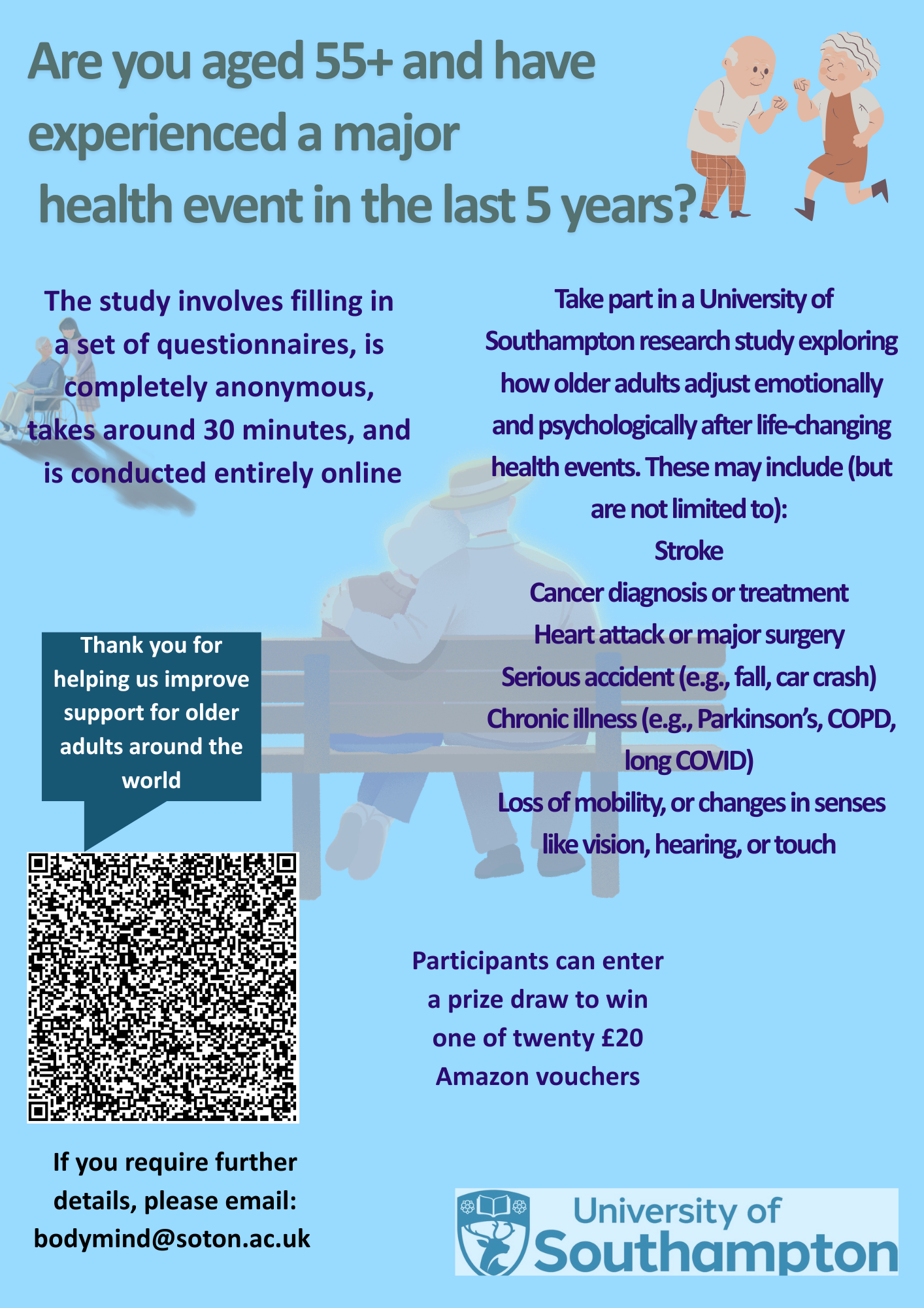 The University of Southampton is looking at how adults aged 55+ emotionally and psychologically adjust to major physical health events such as a stroke, cancer diagnosis, or serious accident.