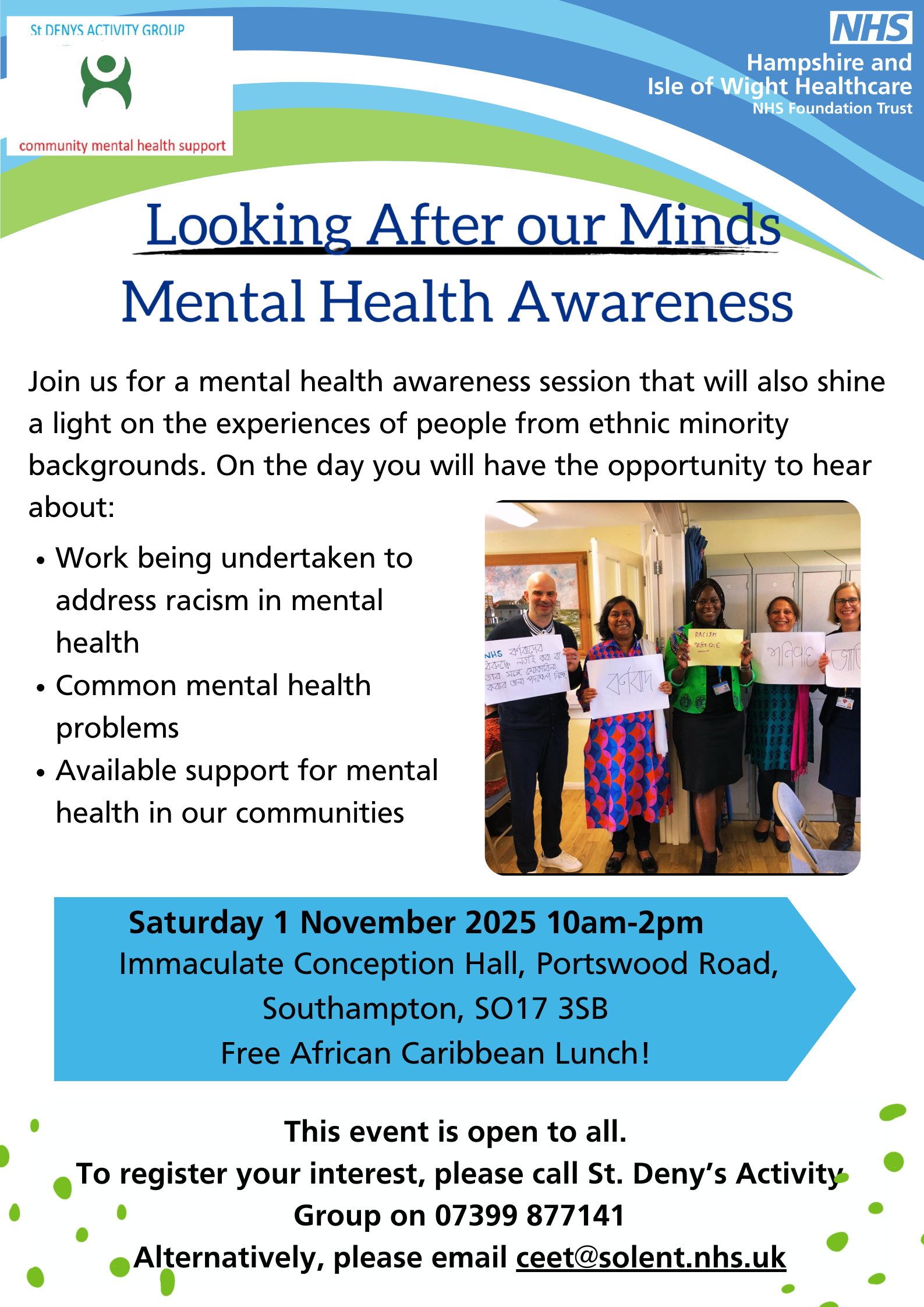 Join St Deny's Activity Group for their Mental Health Awareness Event, Saturday 1st November, 10am - 2pm, Immaculate Conception Hall.