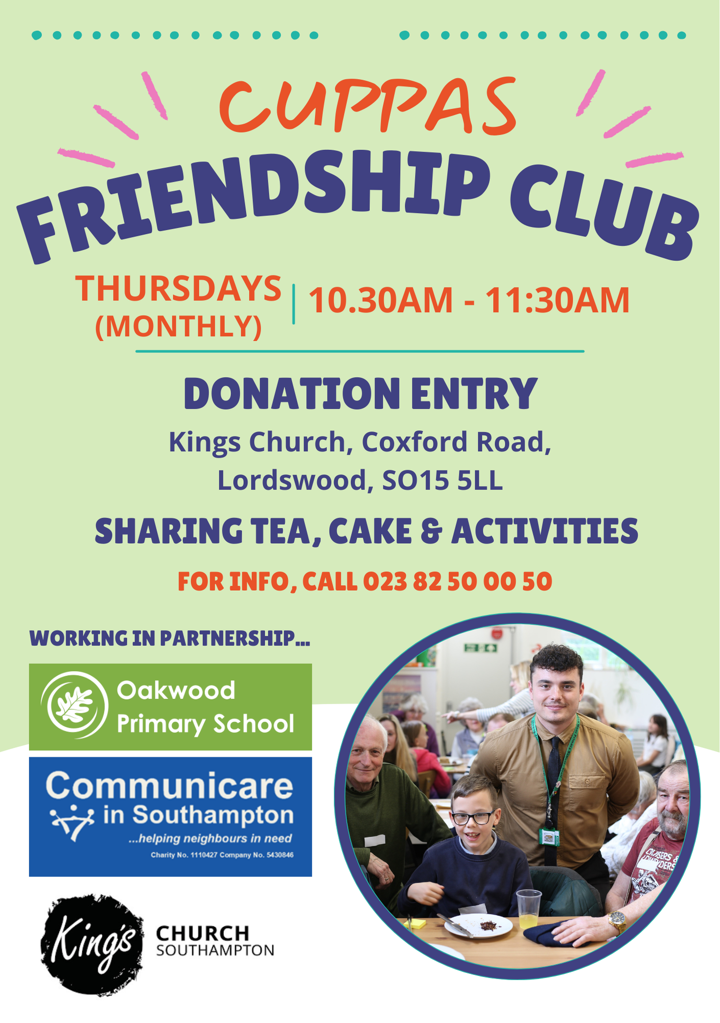 Join Communicare in Southampton and the children from Oakwood Primary School for their monthly friendship club at the Kings Church, Lordswood. Running on the 3rd Thursday of every month. Donation entry.